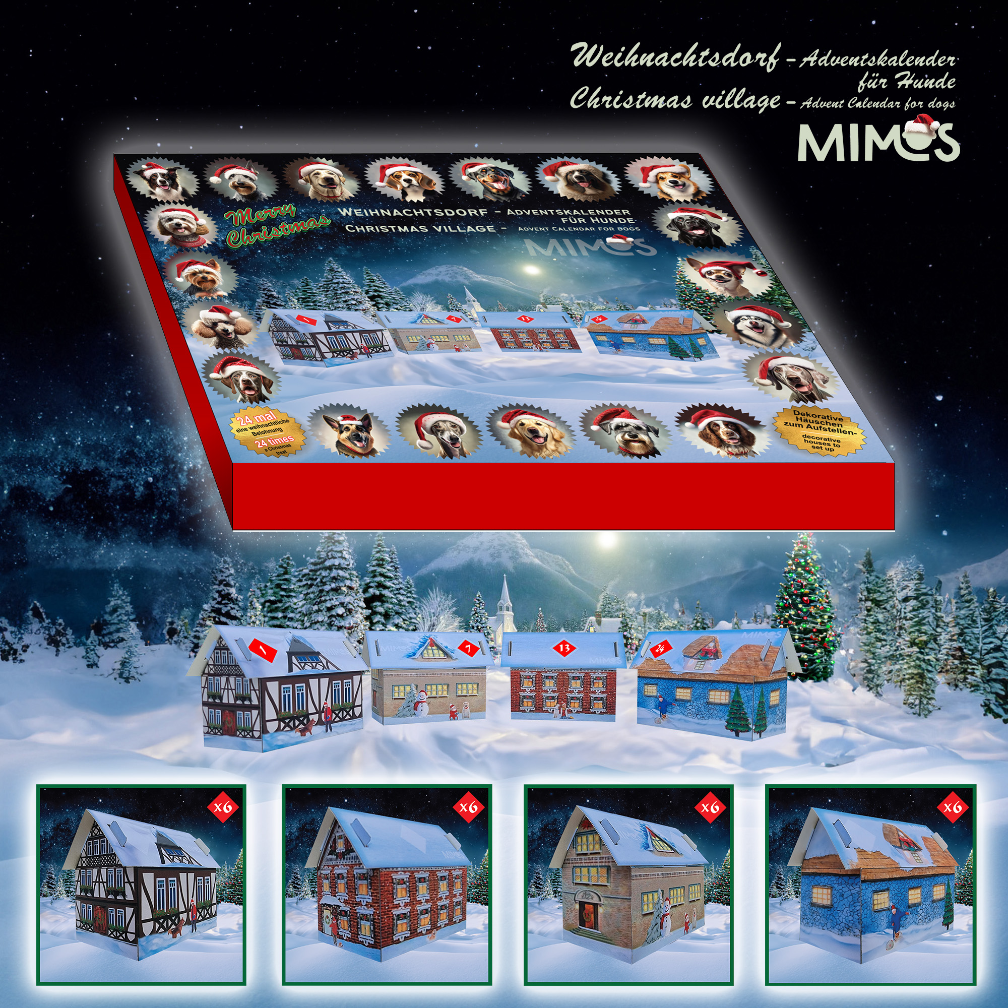 Das Mimos Weihnachsdorf besteht aus 24 dekorativen Weihnachtshäuschen, Anleitung zum Aufbauen, sowie 24 leckere Kausnacks zum Befüllen. So können Sie Ihren Vierbeiner in der Adventszeit jeden Tag mit einem Kauspaß überraschen. Denn auch unsere besten Freunde wollen diese besondere Zeit im Jahr genießen.